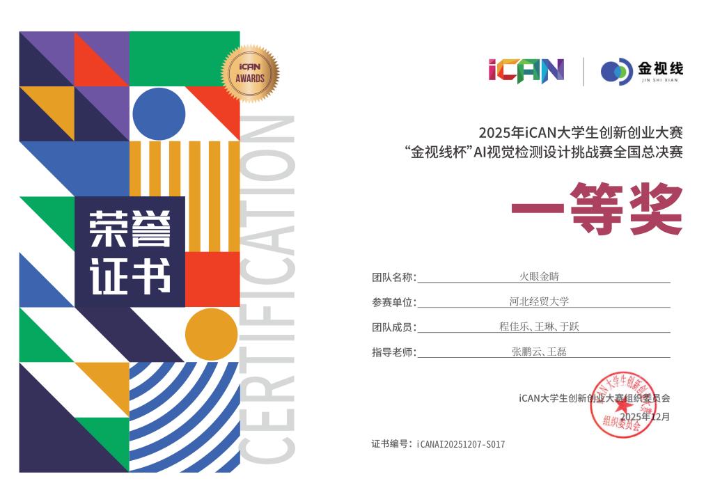 近日,2025年iCAN大学生创新创业大赛“金视线杯”AI视觉检测设计挑战赛全国总决赛圆满落幕。河北经贸大学ok138cn太阳集团古天乐人工智能系程佳乐队和要雨涵队,在王磊、朱晓莲和张鹏云3位指导教师带领下,从全国302所院校3126名参赛者中脱颖而出,分别荣获国赛一等奖与三等奖,充分展现了我院人工智能专业的育人成果与学子的创新实践能力。