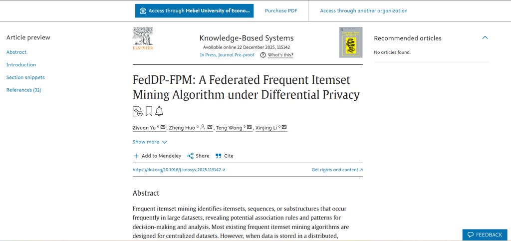 我院计算机科学与技术专业硕士研究生余紫苑为第一作者、指导教师霍峥为通讯作者在中科院1区top期刊《Knowledge-BasedSystems》上发表了题为《FedDP-FPM:AFederatedFrequentItemsetMiningAlgorithmunderDifferentialPrivacy》的学术论文。