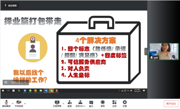 4月12日下午,我院邀请北京邮电大学刘佳老师通过腾讯会议做择业就业指导讲座,此次讲座由学院党委副书记李丽主持,学院全体毕业生及部分大三学生参加。