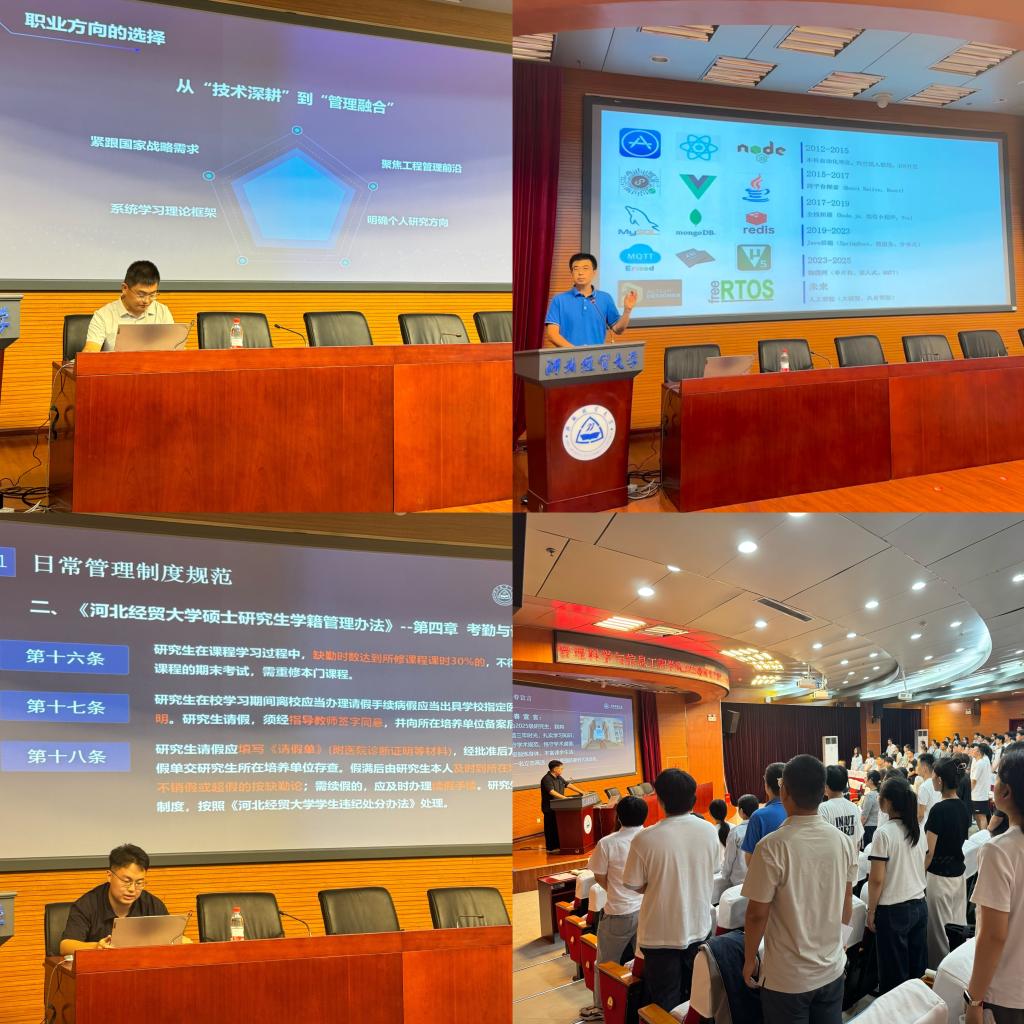 副院长王芹鹏通过“典型案例警示”“政策条文解读”的方式,展开学术规范与科研伦理专题讲解,告知新生学术研究的“红线与底线”,让每位同学将“诚信”二字刻在心里。紧接着,导师组组长贺萍开展“文献资源利用方法及人才培养方案解读”专题指导。她系统介绍了学校文献资源体系,同时清晰解读了培养目标和课程模块设置,帮助新生为科研起步奠基,助力新生明确学业规划方向。学科秘书曹洋开展学籍管理、培养管理、奖助体系等制度政策专题解读,并进行了现场答疑。