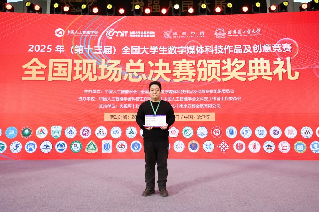日前,我院学生董欣悦、赵建华、姜婧,段亚凡(研究生)、苏琛(研究生)及指导教师董一兵组成的参赛队伍,在2025年第十三届全国大学生数字媒体科技作品及创意竞赛全国总决赛中荣获一等奖,指导教师董一兵荣获“优秀指导教师”称号。