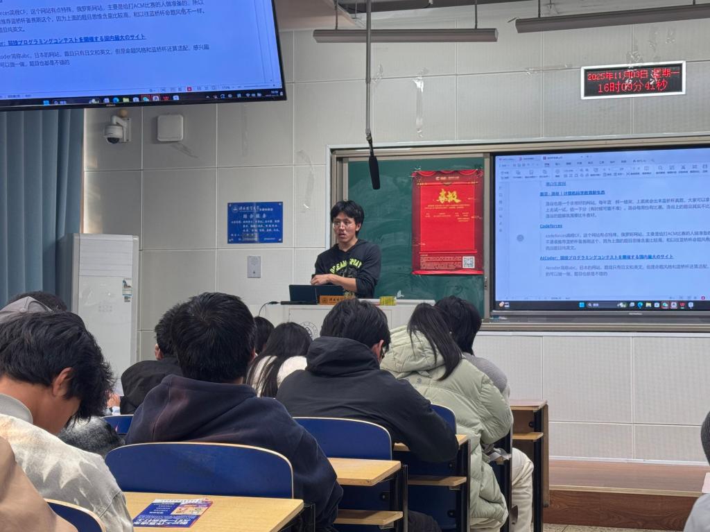 孙院长发表了热情洋溢的致辞。他首先对在第十六届蓝桥杯比赛中获奖同学表示热烈的祝贺,并对指导教师的辛勤付出表示衷心的感谢。孙院长强调了蓝桥杯等高水平学科竞赛在培养学生创新精神、实践能力与团队协作意识方面的重要作用,是检验教学成果、提升学生综合素质的有效平台。他鼓励同学们积极投身于此类竞赛,勇于挑战自我,在实战中锤炼专业技能,并预祝同学们在即将到来的第十七届蓝桥杯中再创佳绩。随后,孙立辉院长亲自为在第十六届蓝桥杯全国总决赛中获奖的学生颁奖,现场掌声雷动,气氛热烈。史正阳同学作为优秀学生代表发言,他不仅在第十六届蓝桥杯中荣获国赛奖项,同时也是学校ACM程序设计竞赛队的队长。史正阳同学结合自身多次参与大型编程竞赛的丰富经验,从赛前知识储备、算法训练方法、时间管理、心态调整以及团队协作等多个维度,向在场的学弟学妹们分享了宝贵的备赛心得与实战技巧,为有意参赛的同学提供了清晰的学习路径和积极的榜样力量。负责竞赛组织工作的薛学亚老师就第十七届蓝桥杯的报名事宜进行了详细讲解,对同学们普遍关心的问题进行了现场解答,并提醒同学们务必密切关注官方通知,严格按照规定时间完成报名,并鼓励大家提前准备,积极备战。