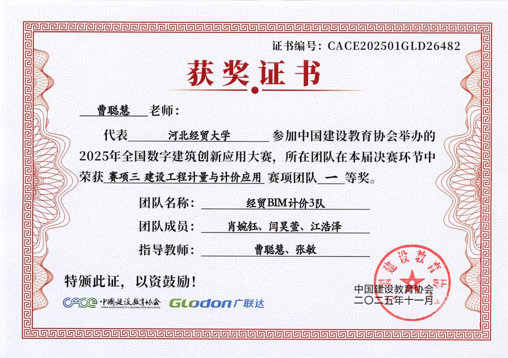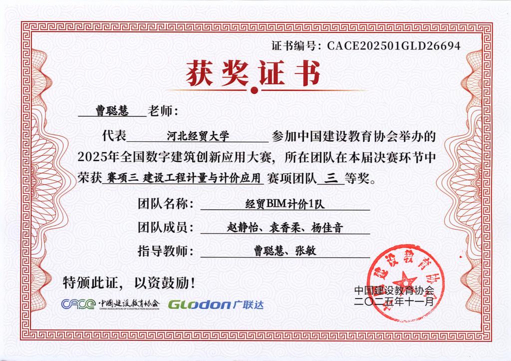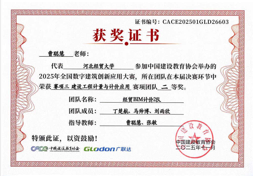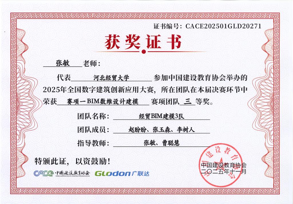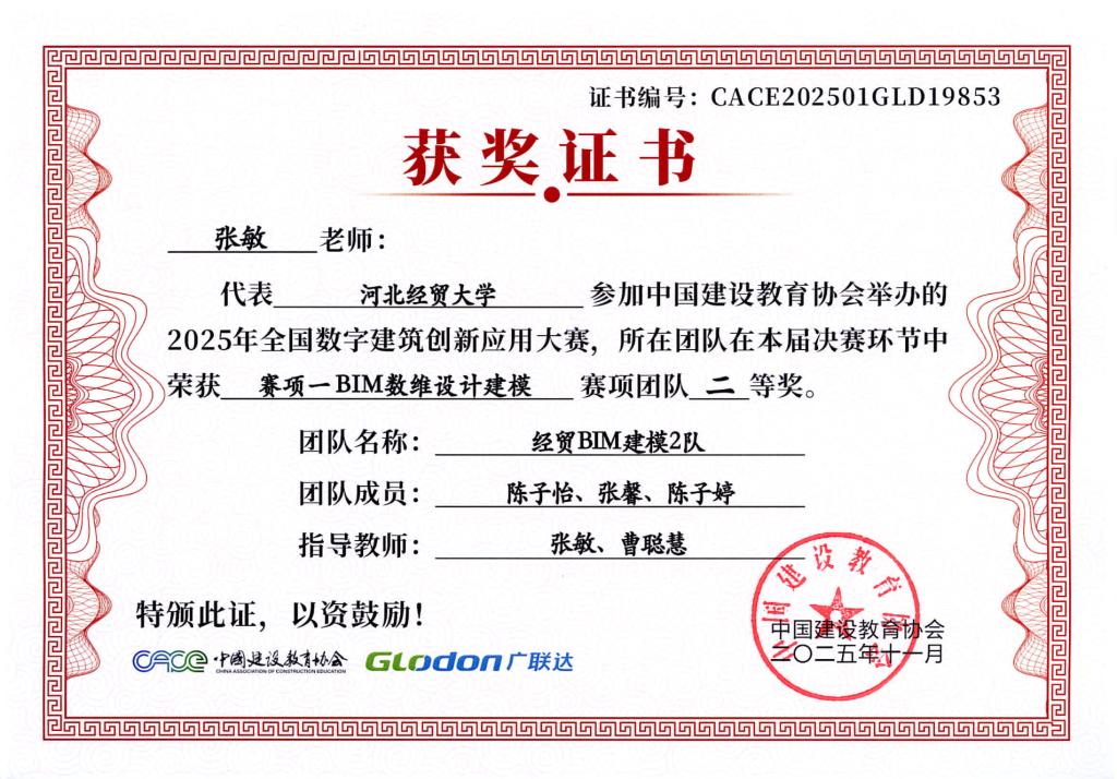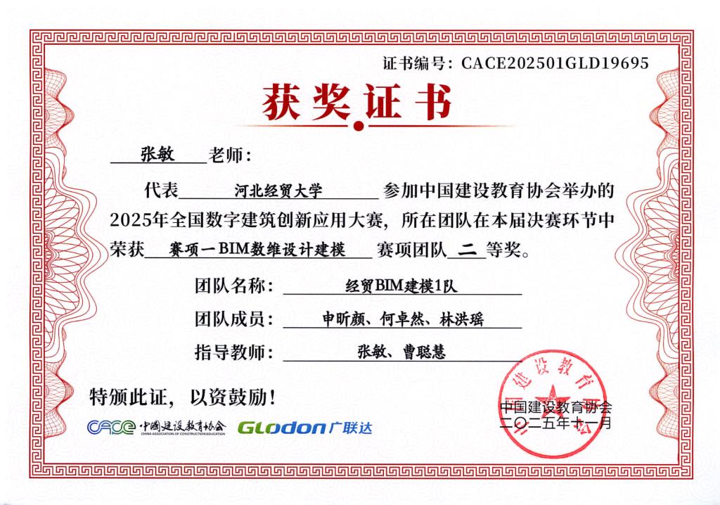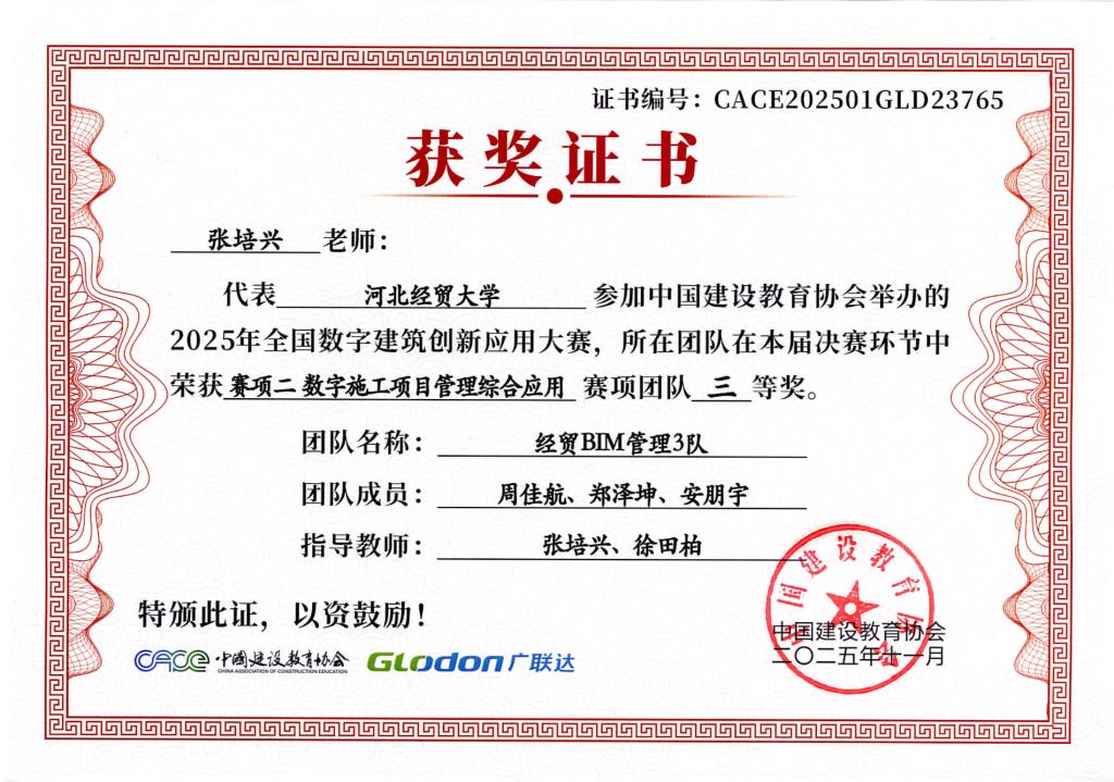 本次大赛由中国建设教育协会主办,国家数字建筑行业产教融合共同体与广联达科技股份有限公司共同协办。大赛设置了BIM数维设计建模(赛项1)、数字施工项目管理综合应用(赛项2)、建设工程计量与计价应用(赛项3)三个赛项,分为两个阶段进行,2025年9月20日举办全国选拔赛,前60%进入2025年10月18日全国总决赛。大赛自2025年4月启动,ok138cn太阳集团古天乐工程管理系曹聪慧、张敏、张培兴、徐田柏等老师积极组织了9支队伍报名参加,经过精心的备赛,共有7支队伍突围进入总决赛,最终取得7项奖项。